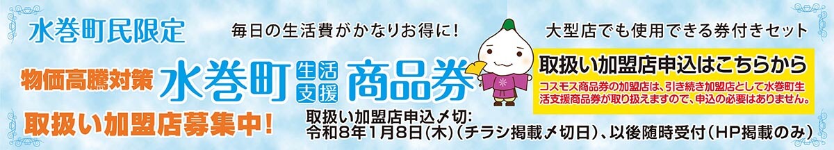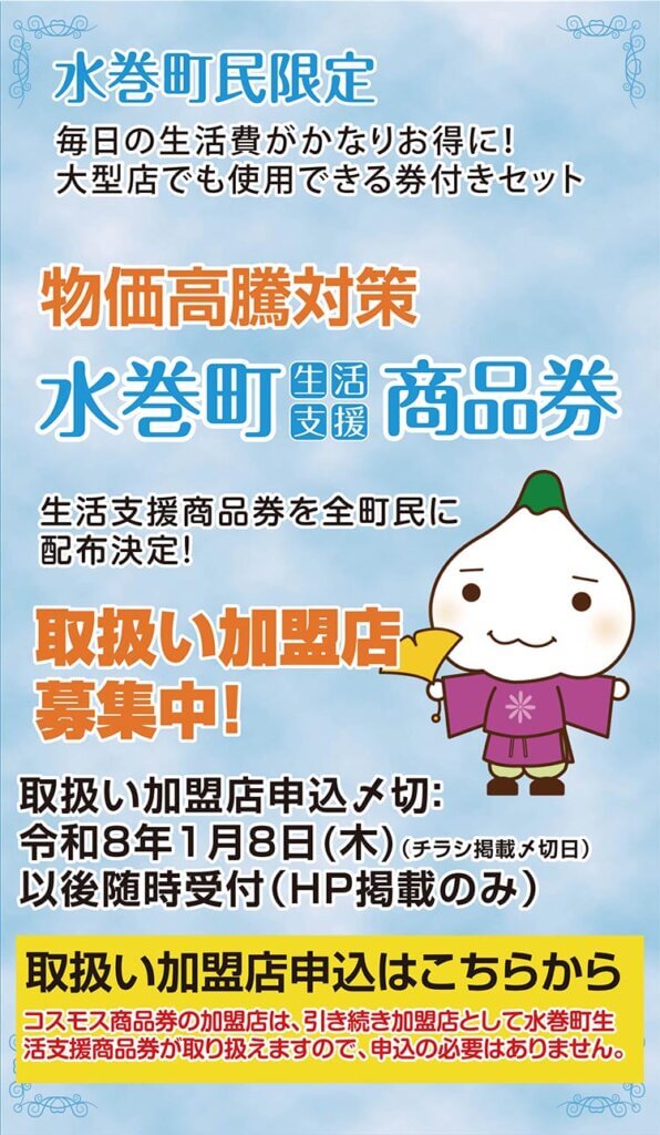 スマホでお得にお買い物ができるデジタル商品券「水巻Pay」の販売情報・取り扱い店舗情報などがご覧いただけます。